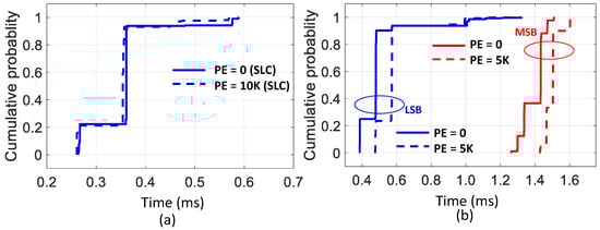 NAND flash memory exhibits limited endurance, which is typically specified by the maximum number of program–erase operations (or PE cycles) allowed on a memory block. The number of PE cycles may impact the nominal page program time, , and stressed pages with a high number of PE cycles may take more time to program [,,]. Hence, an implementation of EXPRESS needs to consider the number of PE cycles. Figure 12a shows the cumulative distribution of the nominal page program time for SLC pages in a fresh flash memory block, and in a memory block that has been exposed to 10,000 PE cycles. Similarly, Figure 12b shows the cumulative distributions of the nominal-page program times for the LSB and MSB pages in the MLC mode, for a fresh block and a block exposed to 5000 PE cycles. We find that the average increases with PE cycling in the MLC mode, whereas a minimal change is observed in the SLC mode.