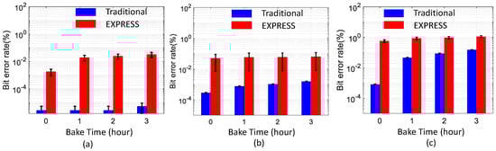 Figure 13 summarizes the results of an experiment that explores the effects of EXPRESS on the data retention for both the SLC and MLC modes of operation on PE-cycled blocks. It shows the bit error rate of the data written by EXPRESS (red bars), and the data written by the nominal program operation (blue bars). To accelerate the retention loss, we bake the chip at a higher temperature (120 °C) for 1, 2, or 3 h. Using the acceleration-factor-based calculation, we find that the 3 h of baking time corresponds to 5 years at room temperature, assuming the activation energy for the charge loss in the 3D NAND as []. The results in Figure 13 show that the BERs for the EXPRESS write increase relative to the traditional programming, after the accelerated retention test. The temporary read error is a new reliability issue in 3D NAND Flash [,]. It is not considered in this case, as the BERs are <1% for all the types of pages and, hence, can be corrected using standard error-correction techniques [,,].