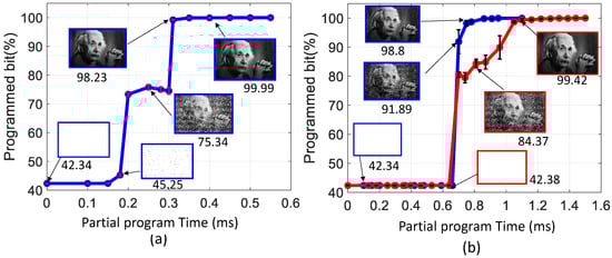 Percentage of programmed bits as a function of partial-page program time for the image data on (a) SLC, (b) LSB (blue), and MSB (red) pages.