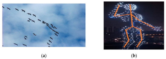Figure 1. Two task-driven systems with certain network shapes: (a) birds’ migration; (b) drone formation. - Drone animation (Figure 1b): In an amazing drone light show, although each drone can move freely in its local region inside the swarm, they maintain the overall shape of a human body [4].