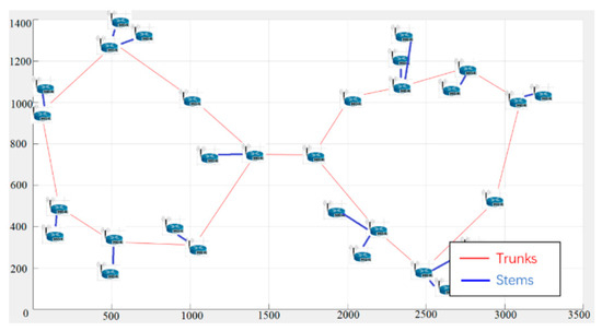 As an example of the FWR concept, Figure 2 shows the identified framework for an example network topology. This proposed protocol can detect two categories of skeletons: trunks and stems, where trunks form the main routing paths of the network (used to transmit high-speed traffic), and stems help to connect ‘leaf’ nodes to the trunk(s). In the rest of the paper, the term ‘framework’ and ‘skeleton’ will be used in an exchangeable way.