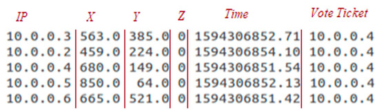 The position table illustrated in Figure 3 is used for the master node selection. The last column of the table, named ‘Vote Ticket’, provides information for master UAV selection. Before a node distributes its local position table to its neighbors, it calculates the geographic center for the swarm and computes the swarm master. Then, the local node adds its selected master UAV’s IP address to the ‘Vote Ticket’ column. In Figure 3, we can see that all nodes selected the node with IP address 10.0.0.4 as the master node. A program thread has been built to periodically check the local position table. If the local node has the highest percentage of votes, it is selected as the master node.