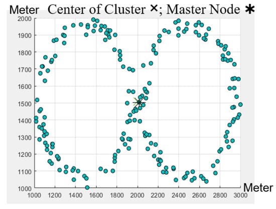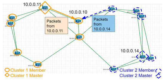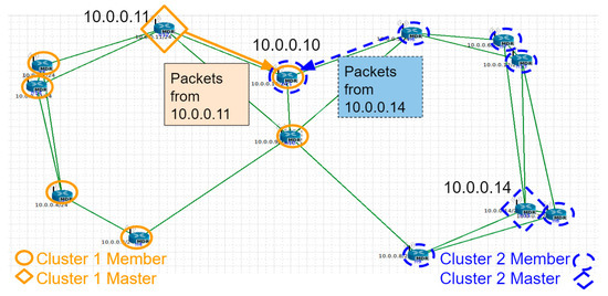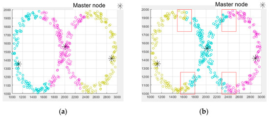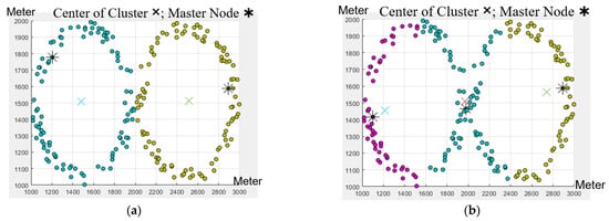 To select multiple masters, a large network can be separated into sub-groups (clusters). Each cluster then selects its own master. Figure 5a,b shows two examples of swarm clustering and master selection. Figure 5a has two clusters; hence, two masters were selected. Similarly, Figure 5b has three clusters with three masters.