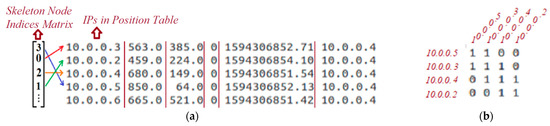 The skeleton node index matrix (SNIM) is a one-column matrix containing indices that point to different IPs (see Figure 3, the position table). In Figure 6a, the first number ‘3’ means that the fourth IP address 10.0.0.5 in the position table is one of the skeleton nodes.