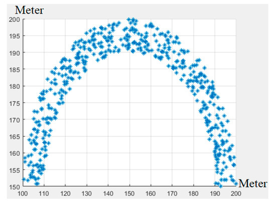 Figure 8 shows an example swarm pattern. The pattern has a size of 100 m × 50 m. We enlarged the same pattern by factors of 10 and 100, respectively, to get two more example swarms with sizes 1000 m × 500 m and 10,000 m × 5000 m, respectively. Their normalized data results are shown in Figure 8. Notice that, even with different network sizes, the same position pattern will have a similar normalized result.