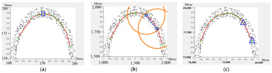 Figure 9a shows the results of applying the skeleton detection algorithm to the topologies shown in Figure 8. Figure 9b shows the result with swarm size 1000 m × 500 m, and Figure 9c shows the result with swarm size 10,000 m × 5000 m. The skeleton nodes are highlighted with large dots, and the links among them are highlighted with lines. As we can see, with the same normalized input data, the skeleton detection algorithm generates similar results with different sizes of the points clouds. We can call such results rough skeletons.