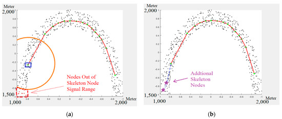 (a). Nodes out of skeleton nodes’ RF range; (b). added skeleton nodes.