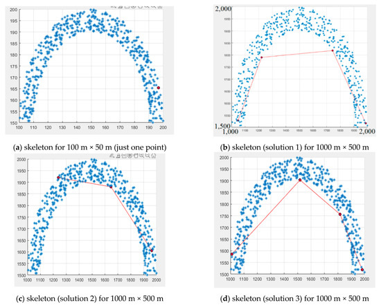 (a). Extracted skeleton for network size 100 m × 50 m; (b) size 1000 m × 500 m; (c) 10,000 m × 5000 m.
