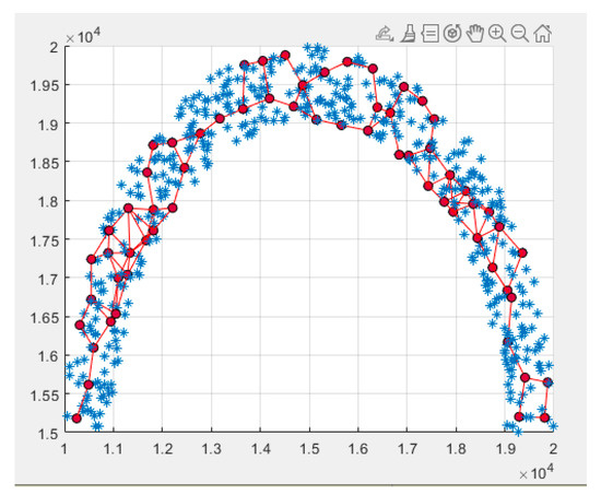 On the other hand, a skeleton detection algorithm that ignores the actual size of the network may generate a result that lacks necessary skeleton nodes. In Figure 9c, the skeleton nodes marked with triangles have a distance larger than the signal range (600 m). Some intermediate nodes need to be added between them to enable all skeleton nodes to reach each other.