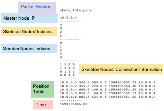 The selected UAVs encapsulate all the skeleton information and other necessary information into an SIP and distribute it to the network. Figure 13 shows an example of an SIP generated by the master node 10.0.0.4. The packet contains seven parts. The first part is the packet header. The second part indicates the master node’s IP address. The third and fourth parts contain skeleton information indices (already shown in Figure 5). The fifth part shows the connectivity information among skeleton nodes, and the sixth part is the position table. The seventh part records the time at which the master node distributes this packet.