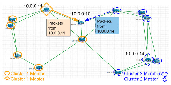 In Figure 14, two nodes, 10.0.0.11 and 10.0.0.14, are selected as the master nodes, both highlighted as rectangle boxes. The master for cluster 1 is highlighted by a solid rectangle box, its group members are highlighted with solid cycles. Cluster 2 is highlighted with dash cycles and a rectangle box. The SIP eventually arrives at node 10.0.0.10, which examines the clustering information in the packets and finds out that it is a member of master 10.0.0.11. Then, only the SIP created by 10.0.0.11 is forwarded further.