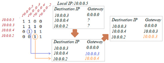Figure 18 is an expansion of Figure 6. It illustrates how to trace the matrix and find out the proper gateway. The local node (with an IP address of 10.0.0.5) can build a direct link with node 10.0.0.3. Hence, the first row adds destination (IP 10.0.0.3) with gateway 0.0.0.0. Through the analysis of the skeleton node 10.0.0.4 in the connection representation matrix SCRM, a connection can be established between 10.0.0.5 and 10.0.0.4 through the gateway 10.0.0.3. Similarly, 10.0.0.2 can establish a link with 10.0.0.5 through gateway 10.0.0.3. The non-skeleton node (or called ‘leaf’ nodes) can be added to the routing table after finding the closest skeleton node.