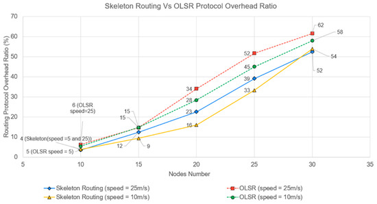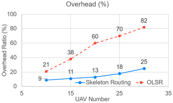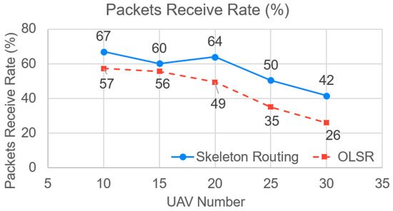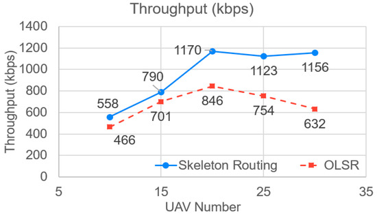 We first tested the throughput, packet reception rate, and protocol overhead. A higher packet reception rate means a lower packet loss rate (thus higher link reliability). Each node moves around at a speed of 30 m/s. The swarms with sizes 10, 15, 20, 25, 25, and 30 were tested. Figure 19, Figure 20 and Figure 21 show the test results for throughput, packet reception rate, and overhead, respectively. Our routing scheme outperformed OLSR in all those three metrics. As the system size increases, there will be a less chance for the network to split into a disconnected swarm. Hence, both skeleton routing and OLSR cases showed throughput increases at the beginning. However, our scheme can detect traffic paths with better stability and less chance to experience a path failure. Our scheme, in turn, provides better throughput as well as packet delivery ratio. In addition, skeleton routing’s protocol overhead ratio (measured by the percentage of protocol messages and overall packets sent) has a much lower increasing rate when the network (swarm) size is increasing. This is because our scheme only has compact position information (or link information if GPS is not available) and skeleton information needs to be flooded in the network. Even with limited wireless channel consumption, our protocol still provided traffic paths with better quality. Due to the lower overhead ratio, our routing scheme can also have more wireless channel resources available for the user’s data.