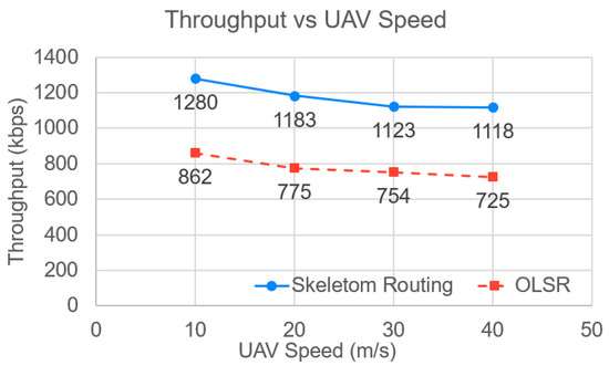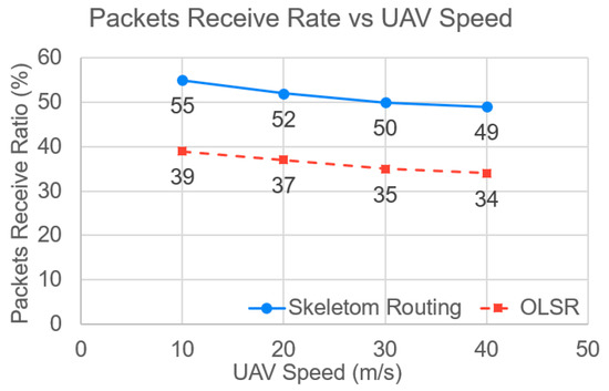 Further tests were performed to verify the effects of node movement speeds. The network size was kept at 20. Constant node speeds with 10, 20, 30, and 40 m/s were tested. Figure 22 shows the throughput results. Figure 23 shows packet reception rate results. Our routing scheme performed better than OLSR for all four-speed settings. The speed does not have big effects on protocol overhead. The OLSR has around 60% overhead for all situations, our routing scheme has around 13% overhead.