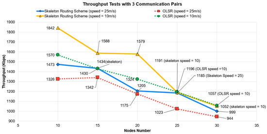 To comprehensively investigate the performance comparisons between our skeleton routing and OLSR scheme under multiple communication pairs (i.e., multiple sources send data to their destinations), we have measured the throughput changes under various network sizes and node speeds. The existence of multiple pairs reflects the actual scenarios in MANETs. Those traffic flows may cause wireless interference to each other if their path nodes are close to each other. As shown in Figure 24, in any mobility speeds and network sizes, our routing scheme has higher throughput performance. However, as the nodes number increases, the advantages are trend to decrease. That is because multiple traffic flows may share the same extract network frame as traffic path. This leads to a more detailed trunks and steams path selection algorithm to avoid medium contention, which left for future works.