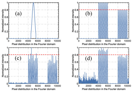 In this paper, the performance of the proposed algorithm is demonstrated by a simulation of beam splitting. The simulation uses Holoeye’s 4k LCOS to load the holograms. In order to match the actual application and better illustrate the algorithm effect, this paper only selects = 1024 pixels in the middle part of the x axis as the effective pixel area, which also reduces calculation by a certain amount. To show speckles in the output image as much as possible, this work uses 10-fold excess zero padding. Thus, the total sampling points on the x axis are 10,240, and the number of actual effective sampling points is 1024 in the middle. Table 1 shows some parameters used in the simulation.