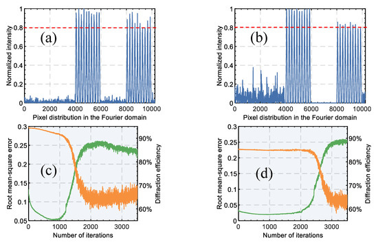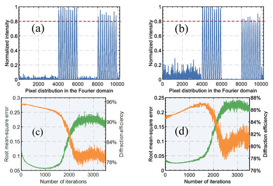 Figure 4 shows the simulation results of the proposed algorithm, where m/n = 5/1. This is equivalent to slightly biasing the optimization result toward the diffraction efficiency. Figure 4a,b shows the intensity distribution. The initial populations in Figure 4a,b are those in Figure 3c,d, respectively. That is, the proposed algorithm is used to optimize the results of IFTA and SIFTA. Figure 4c,d shows the optimized curves of Figure 4a,b, respectively. Orange represents diffraction efficiency, and green represents RMSE. Table 3 shows the key evaluation values of Figure 4.