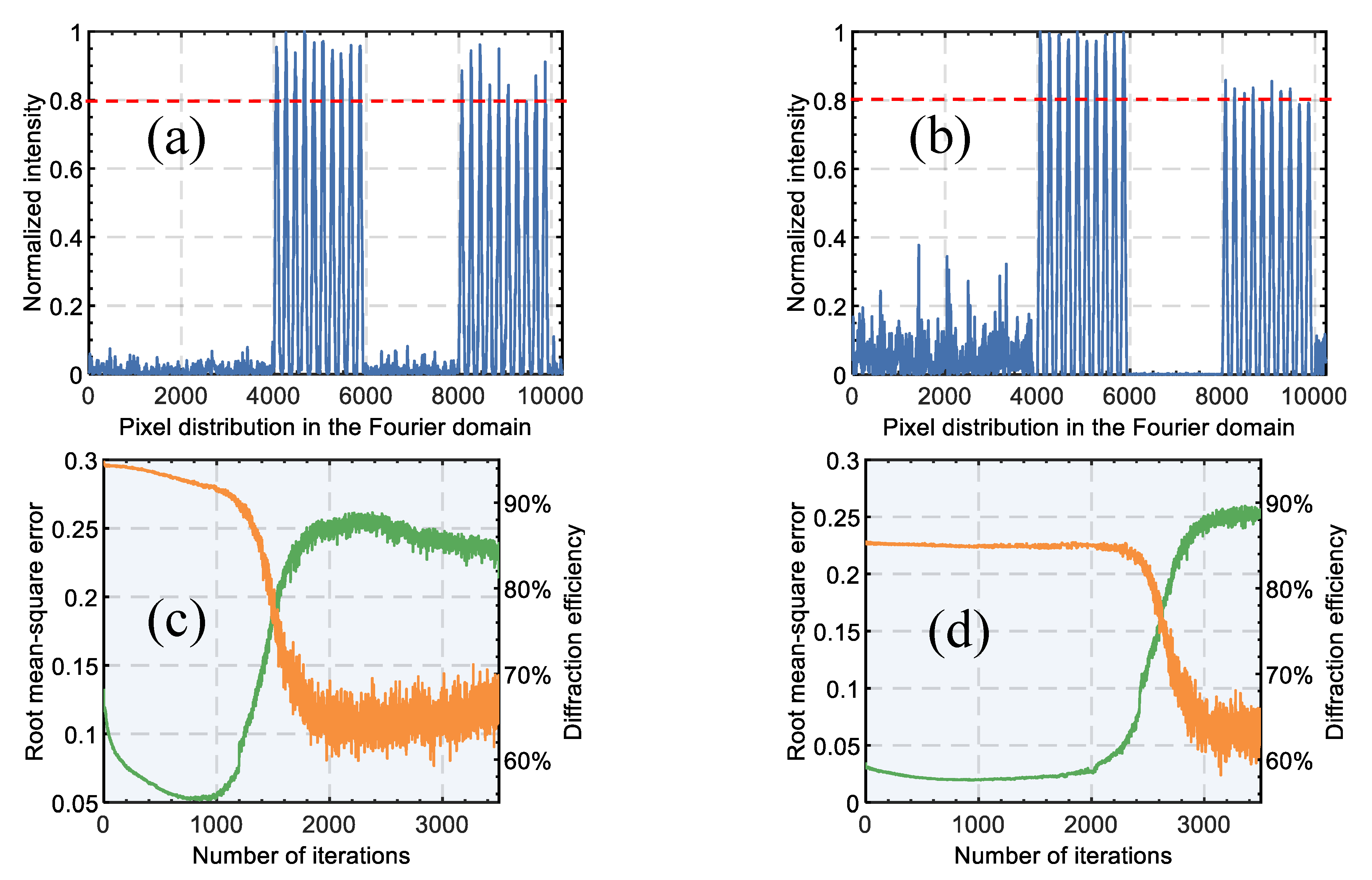 - First, make the necessary zero padding for the initial sampling points, and then use IFTA or SIFTA to optimize until they stagnate. Obtain the complex amplitude in the Fourier domain.