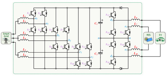 In addition to electric mobility, the considerable installation of RES in different scenarios, from microgeneration to large-scale, is also contributing to revolutionize the power grids and to the expansion of microgrids and hybrid AC/DC grid scenarios [23]. The cooperation between EVs and renewables forces the adoption of new conditions of power management, also targeting novel opportunities to appear, considering the power grid constraints [24]. The influence of EVs in different modes aiming to stabilize the power grid voltage and with the introduction of renewables is accessible in [25]. Smart EV charging strategies, supported by algorithms to maximize the collaboration with renewables, are proposed in [26]. A specific power management stratagem supported by the integration of EVs and renewables with different power profiles is offered in [27]. A cost minimization of EV charging stations with renewables is presented in [28]. The impact of EVs and renewables, in particular photovoltaics (PVs), on future power production in the point of view of investment, is discussed in [29]. Nevertheless, the aforementioned studies and implementation are fundamentally established by resorting to control algorithms targeting the maximization of power production from renewables for EV charging, maximizing the cost benefits of the user, and establishing power management strategies compliant with both parts; however, the hardware structures are omitted. Moreover, it is not mentioned how the power converters interact with each other, which is of interest since not all control strategies can be implemented, as they depend on flexibility of electronic power converters. A system to interface a DC–DC EV charger and PV panels with the power grid is investigated in [30], but the details of the used topology are not discussed, nor are the power quality issues. An innovative multimode single-leg power converter is suggested in [31] to control the power flow between DC technologies, but without interfacing the power grid. A multi-port topology used to combine EVs and renewables with the power grid is proposed in [32], but the disadvantage relies on the use of two converters for interfacing the power grid: an active rectifier and a grid-tie inverter. An approach considering EVs, renewables, and energy storage systems in the perspective of the power grid independence is presented in [33], but considering independent power systems for each technology. Nonetheless, power quality concerns are not considered in any of these works.