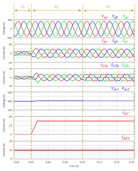 Specifically for phase a, Figure 5 shows the phase current (iUTa), as well as the currents (iUTa, iUTb) on each leg of this phase. Since these currents are presented in detail, the interleaved operation is highly visible, characterized by the currents iUTa and iUTb in phase opposition, and by the current iUT that is the sum of the currents iUTa and iUTb. Consequently, the current iUTa presents a ripple with a frequency that is the double of the switching frequency (i.e., the double of the ripple frequency of the currents iUTa, iUTb). Figure 6 shows the power grid phase-to-phase voltages (vgab, vgcb, vgca) and the voltages of the unified topology on both AC-side (va1b1, vc1b1, vc1a1) and DC-side (vd1d2, ve1e2). The voltages on the AC-side (va1b1, vc1b1, vc1a1) assume the possible three voltage levels (+vdc, 0, −vdc), are balanced and are in phase with the respective phase-to-phase voltage (vgab, vgcb, vgca). On the other hand, the voltages on the DC-side (vd1d2, ve1e2) assume the three voltage levels. In the case of the interface of the EV, in this specific case, it is shown that the voltage assumes the values of 0 and vdc/2, while in the case of the interface of the RES, in this specific case, it is shown that the voltage assumes the values of vdc/2 and vdc. The assumed values on each DC-side can be different, depending on the voltage on the DC interfaces as well as the voltages on the DC-link.