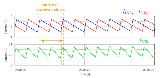 Detail of the interleaved operation in phase a, showing the phase current (iUTa), and the currents (iUTa, iUTb) on each leg of phase a, permitting to visualize that the currents iUTa and iUTb are in phase opposition, and that the current iUT is the sum of the currents iUTa and iUTb.