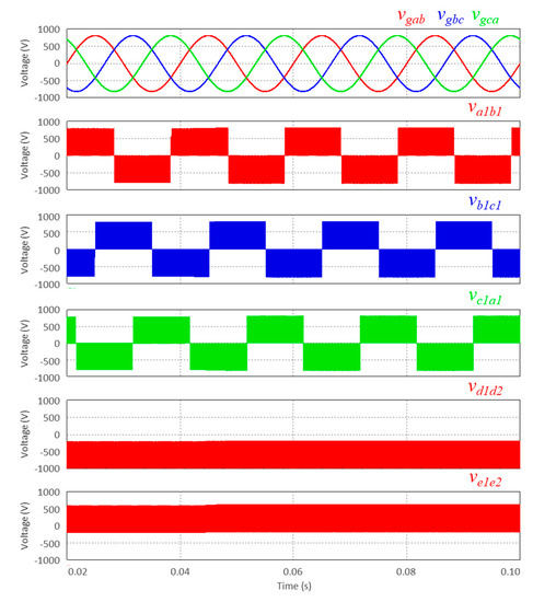 Detail of the power grid phase-to-phase voltages (vgab, vgcb, vgca) and the voltages of the unified topology on both AC-side (va1b1, vc1b1, vc1a1) and DC-side (vd1d2, ve1e2).