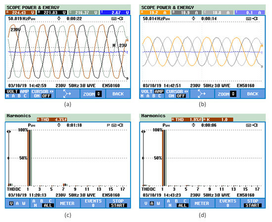 Figure 8a,b shows the voltages and currents on the AC-side, respectively. In these results, it is visible that the currents present are balanced and have a sinusoidal waveform, which is advantageous in the perspective of not accentuating power quality concerns for the power grid. For these same voltages and currents, Figure 8c,d shows the harmonic spectrum and the total harmonic distortion (THD) value, respectively, showing the values of 4.3% and 1.9%. These results were obtained with a power grid voltage of 400 V-50 Hz (phase-to-phase voltage), a voltage on the DC-link of 800 V, and for an operating power of 12.5 kW. It is crucial to highlight that these results were obtained with the unified topology directly connected to the power grid.