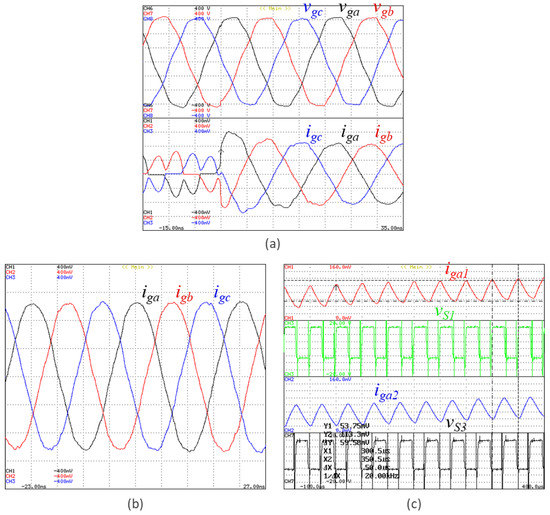 Experimental validation showing a result that validates the operation of the unified topology, compensating almost all harmonic currents ((a) before and (b) after compensation) to contribute to compensate power quality problems on the power grid side: Power grid voltages (vga, vgb, vgc) and currents (iga, igb, igc).