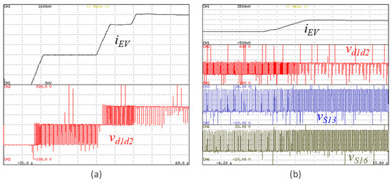 Experimental validation regarding the EV interface with the possibility to operate with three voltage levels, showing the EV current (iEV), the voltage of the unified topology (vd1d2) on the DC-side interface with the EV, and the gate-emitter voltages of the IGBTs S13 and S16 (vS13, vS16): (a) EV current and converter voltage; (b) EV current and converter voltage, and the gate-emitter voltages of the IGBTs S13 and S16.