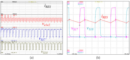 Experimental validation regarding the RES interface with the possibility to operate with three voltage levels, showing the RES current (iRES), the voltage of the unified topology (ve1e2) on the DC-side interface with the RES, and the gate-emitter voltage applied to the IGBTs S17 and S18 (vgeS17, vgeS18) to visualize the interleaved operation: (a) RES current, converter voltage, and the gate-emitter voltages of the IGBTs S17 and S18; (b) Detail of the RES current and the gate-emitter voltages of the IGBTs S17 and S18.