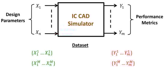 The dimensions of all transistors and passives (W, L), as well as reference currents and voltages (, ) in an analog block are referred to, in this paper, as the design parameters , while the circuit’s performance metrics (e.g., gain, power consumption, etc.) are called the specifications . To build a model capable of predicting , the initial step in supervised learning is to generate a dataset of circuit simulation results that covers the design space sufficiently. Analog designers must define the performance specifications, then simulate the circuit using a computer-aided design (CAD) tool for a significant number of possibilities of the design parameters, as shown in Figure 1. The generation of such a dataset is a time-consuming task that involves people with a decent level of experience and knowledge in IC CAD tools. References [,] used SPICE circuit simulators to generate their datasets.