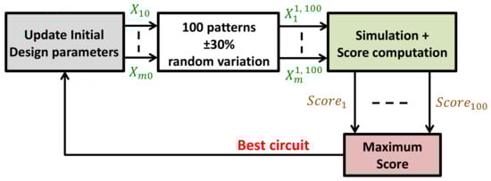 Reference [] proposed a similar, yet different approach for dataset generation: Initial values for the design parameters () were first determined by a circuit designer. Next, 100 different patterns were produced by randomly varying  in the range ±30%. The obtained circuits were then simulated, and a score was calculated to select the best circuit that had the highest score among all. The score was defined as the ratio of higher-the-better performance metrics in the numerator and lower-the-better in the denominator. This process was iterated as many times as needed to build the dataset, with the best circuit from the previous 100 patterns being the starting circuit for the generation of the next 100 patterns. The whole process is depicted in Figure 3.