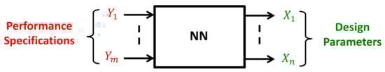 After dataset generation, the aim is to make the NN compute and converge towards a model that predicts the design parameters  from the existing performance specifications . The neural network is asked, in this sense, to solve an inverse problem using a dataset generated from a direct problem definition.