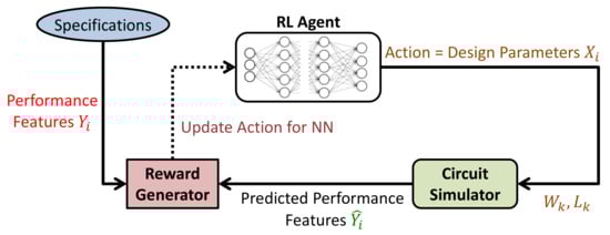Reference [] trained an RL agent for 30–40 h and achieved comparable or better performance than human experts on several circuits. The algorithm would output at each time step a set of values corresponding to the dimensions of the transistors and passive components (i.e., design parameters). The circuit simulation environment would then take those values and compute the performance metrics of the circuit. A reward function was defined based on hard design constraints, as well as good-to-have targets. The reward was formulated to be high if the simulated performance was close to the real values and low otherwise. Their approach was validated on two circuits: two- and three-stage transimpedance amplifiers in CMOS  . Five performance features were targeted: noise, gain, power consumption, AC response peaking, and bandwidth. In both circuits, RL showed promising results, where it outperformed the human experts in the time taken to find the optimal values.