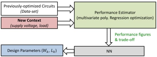 Reference [] proposed a two-step method targeting the re-design of existing analog circuits in new contexts. A context is a group of high-level conditions that impact the performance of an already pre-sized circuit (e.g., load, supply voltage values). The core idea is to use first a multivariate polynomial regression to estimate the performance trade-offs of the optimization and predict the circuit performance for the new context (which differ only moderately from the original ones). Then, the outputs are fed to an NN that trains itself from those updated examples to predict device sizes that correspond to the new performance (Figure 6).