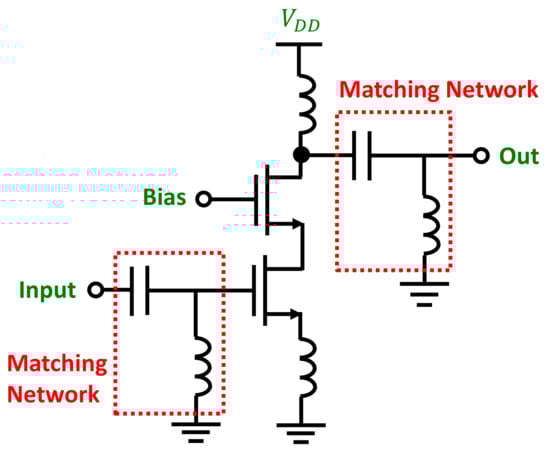In [], the core idea was to delegate part of the NN design to a genetic algorithm (GA) that iterated to decide on the following: the neural network type (multi-layer perceptron or radial-basis function) and which performance metrics and which design constraints to include as the input features during training. The GA was actually given a set of performance specifications and some additional design constraints: the algorithm worked by feeding consecutively several subsets of the two previous variables to the NN, thus removing and adding input elements depending on the training and validation results. The best combination of NN type and set of features/constraints was selected as the optimal solution to perform the prediction of the circuit. One novelty in the proposed technique was that the constraints on the design parameters (to be predicted) were actually presented as additional inputs to the GA-NN combination to help reduce the level of under-determination. This hybrid approach was tested on a wide-band low-noise amplifier (LNA) based on a common-source cascode circuit with inductive degeneration, working at 3 GHz with input and output matching networks (see Figure 7).