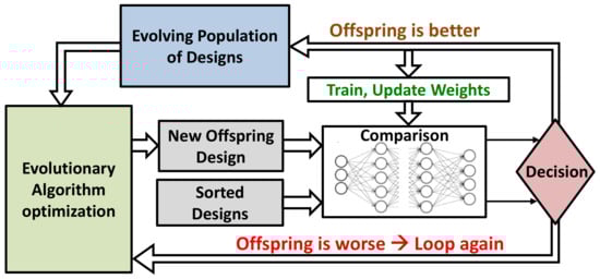 A novel learning framework based on evolutionary-algorithm optimization with an embedded neural network was proposed in []. At each step of the optimization, a new design was derived from the previous (population-based method). The NN came into action only to assist in the sampling process that selected the best candidate design for the next generation. Predicting whether an offspring design was better than its parent was realized by a Bayesian NN that mimicked the circuit simulator with an additional benefit of being faster. In fact, it did not predict the circuit performance exactly; instead, it only classified two design samples (parent and current offspring) and output which one was better for each specification separately. The NN was trained progressively during the optimization and converged to stable weights quickly, since it only helped in increasing the sample efficiency (see Figure 8). This novel method was tested on three different circuits: an amplifier similar to [], a two-stage opamp with negative-gm loads, and a mixed-signal system comprising an optical link receiver front-end. Moreover, layout parasitic effects were included in the prediction, which constituted a clear advantage.