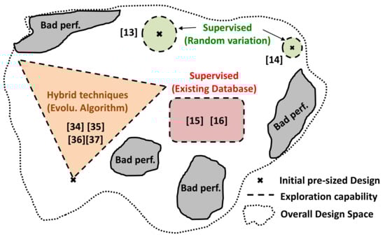 Figure 10 shows the different exploration capabilities of the supervised learning and hybrid techniques studied in this work. Without loss of generality, a simplified two-dimensional representation of the design space was adopted. The wider the exploration within the design space, the higher the generalization of the computed model will be. Ideally, fully random dataset generation would cover the whole white space in Figure 10 by sampling in multiple small regions spread over the entire design space, which is practically very difficult. Some randomized methods start by sampling over the whole design space before zooming-in on promising areas, which would help address this issue.