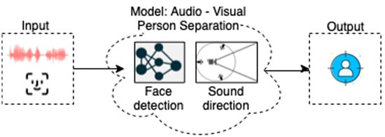 Neuroscience studies [,] and voice perception studies [] have shown that vision, as a sensing modality, has a strong impact on a person’s ability to focus on a particular phenomenon of interest. The research presented in this paper is based on the fusion of audio and visual inputs to separate a single speaker from a crowded place. The model for audio-visual person separation can be classified under audio-visual sound separation systems (AV-SS) []. Such systems aim to extract one or multiple voice targets from a mixture of voice and visual information [,]. This information can then be used in different applications, such as focusing attention [,], establishing eye contact [,], and building a mutual understanding [], etc.