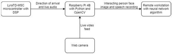 Facial expression extraction was performed on the Raspberry PI microcomputer using Python library OpenCV. The camera was placed on the central axis above the microcontroller so that the DOA angle could be converted to the angle in the camera’s field of view. When properly placed and calibrated, a live camera feed shows a vertical line indicating the direction that the sound (the human voice) is coming from. The implementation of the physical model setup is shown in Figure 5.