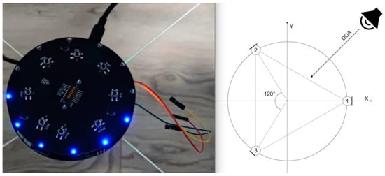 Sound acquisition and direction of arrival (DOA) estimation was achieved by the LyraTD-MSC module designed by Espressif []. The module had 3 microphones placed at the same radius and 120° apart, as shown in Figure 4. The calculation of DOA was performed by a digital signal processing chip, located on the module itself. The module had a step resolution of 5° degrees. The same module was also responsible for filtering the sound and converting it to a digital format.