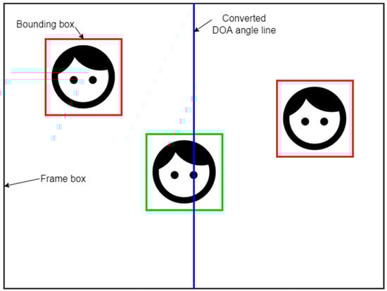 From an image, the algorithm returned an array of bounding boxes. Each bounding box was a set of two coordinates in the format (startX, startY, endX, endY). The relative angle from LyraTD-MSC was then converted to an X coordinate on the acquired image. To achieve this, the camera’s field of view was aligned with an arbitrarily defined angular span on the DOA angle detection module. The conversion formula is defined in (12).