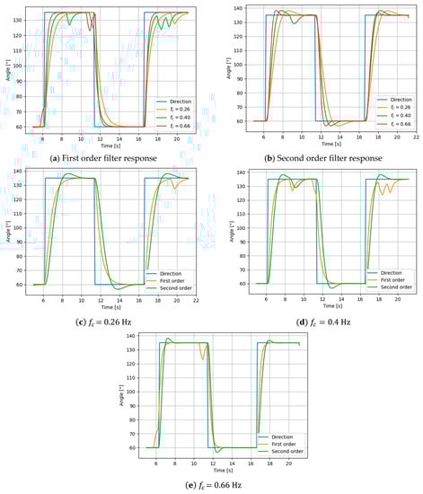 From the results presented, it can be concluded that the filter with the highest cut-off frequency gave the best results, which was expected because a higher cut-off frequency has a faster response. Secondly, the first order filter gave a smaller RMS error compared with the second order filter. This was because the second order filter had an overshoot on the step response. To reduce or to eliminate overshoot, the damping parameter must be lowered, which would also slow down the response time. When comparing first and second order filters (as shown in Figure 8c,d), it can be seen that this type of change in the second order filter further increases the RMS error, compared with the first order filter. Considering all this, for the given application, the first order filter was recognized as better.