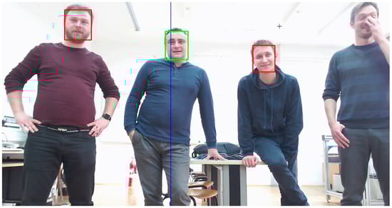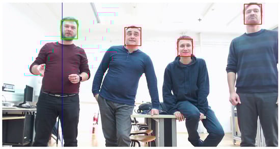 The final information fusion was performed by overlapping information from bounding boxes with the angle information. When the converted angle value was placed between the minimum and maximum value of the X coordinate, the speaker marked with this bounding box was identified as the current speaker, and marked with green color, as shown in Figure 7. In this way, the right speaker was identified and localized, and the robot could start or continue the interaction process.