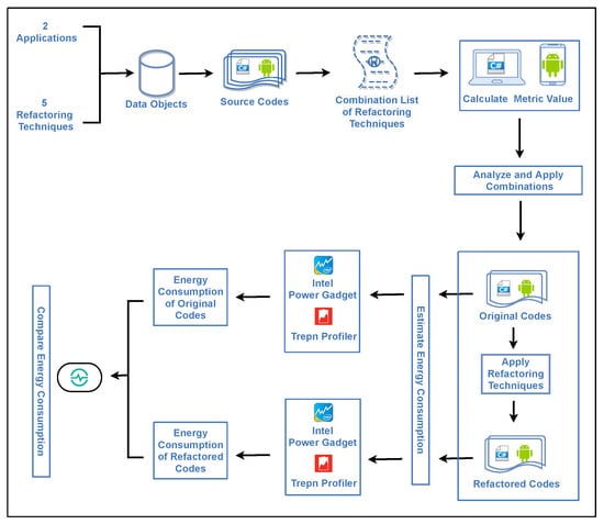 Pioneering studies on the relationship between code refactoring techniques and software energy efficiency were conducted by Silva et al. [12] and Gottschalk et al. [13]. Silva et al. [12] investigated the change in energy consumption values after the “Inline Method”, which is one of the most widely used refactoring techniques, was applied to two different embedded systems. It was observed that refactoring techniques had a positive effect on energy consumption, especially in mobile devices with an Android operating system. Gottschalk et al. [13] optimized the energy-wasteful code detected in the source codes of mobile device applications by refactoring techniques. They also saw energy consumption as a major issue for Android devices and suggested an approach to reduce the energy consumption of applications by reengineering processes, including code refactoring.