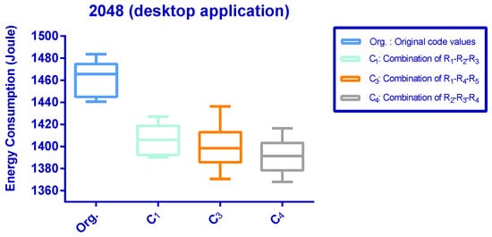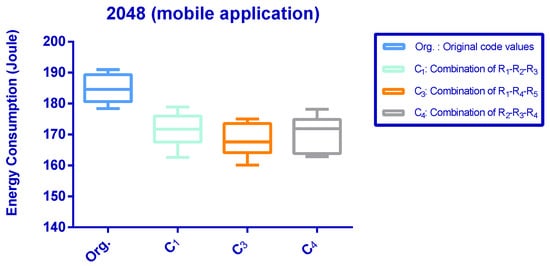 As can be observed in Table 8, the energy reduction rate in using seems quite impressive for both applications. When implementing , the probability of a positive contribution to energy efficiency is lower, whereas, when performing , the probability of a contribution to energy efficiency is higher for the combinations, because the saves the smallest amount of energy in both applications. Results from the application of each of the five refactoring techniques showed that all of the techniques could save energy. Among these, the technique was the one that provided the best energy savings, as seen in Figure 3 and Figure 4. The technique provided the smallest energy savings in the 2048 application. This is because, when applied to the original code of 2048, the reduction in method calls did not cause a significant reduction in byte code calls and consequently had little impact on energy efficiency. The energy consumption of for the 2048 mobile application is more consistent than the original codes as the interquartile range is smaller than the original code values.