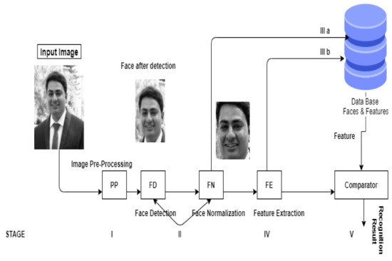 Figure 1 describes the step-by-step procedure of the facial recognition system. In stage I, the image is input, and preprocessing is done. In stage II, face detection and face normalization are done. In stage III a, images are stored in the database after normalization, and in stage III b feature extraction is performed. Then, in stage IV a comparator is used to obtain features from the database and produce results.