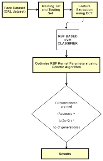 In some of the subjects, factors such as time, lighting, and facial expressions (smile/non-smile, open eyes/closed eyes), and details of faces, such as the subject wearing glasses or not wearing glasses, will be different at different times. The issue will be in the frontal positioning in all images, and the background will be dark and homogeneous. The size of each image is 92 × 112 pixels, and each pixel has 256 grey levels. Each photo in the training and testing sets of pictures was apportioned into the equivalent size of squares. Subsequently, the DCT coefficient was determined for each square. The obtained coefficients were changed to include vectors. Then, the highlight vectors of the training set were prepared by the radial basis function-based SVM. In this, the radial basis function portion boundary of the SVM was streamlined by traditional tasks. Discrete Cosine Transform (DCT) is a strong transform used to extract features in facial recognition. After implementing DCT over all the images, feature vectors were constructed based on Zonal masking coefficients. Optimization was done through GA-RBF. When there was a requirement to compensate for illumination variations, the available low-frequency coefficients were discarded.