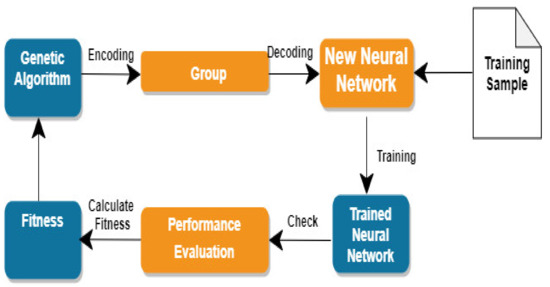 Figure 4 shows the RBF network topology, in which the activation function is taken by the hidden layer in the form of a RBF. Figure 5 shows the entire procedure of the Genetic Algorithm, and Figure 6 explains the automation in the network’s establishment/adjustment and connection weights where human intervention is not required. Accurate mapping of the Genetic Algorithm with a neural network is done.