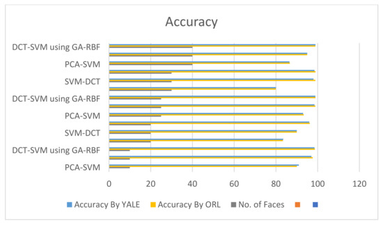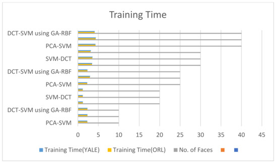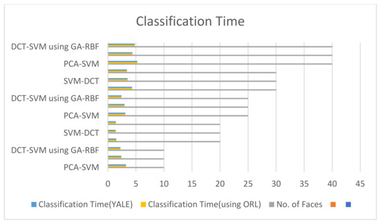 Five different experiments were conducted by varying the number of faces from 10 to 40. A comparison of the proposed model with existing models was made by using several experimental parameters, including accuracy, training time, testing time, and classification time. The accuracy of the models is presented in Figure 7. An average accuracy of 98.346 was achieved by using DCT-SVM using GA-RBF, which is better than the other two models as 86.668 was achieved by PCA-SVM and 96.098 was achieved by SVM-DCT. A comparison of training time and classification time was also made. The average training time of DCT-SVM using GA-RBF is 2.621, as presented in Figure 8, which is better than that of the DCT-SVM and PCA-SVM models. The average classification time for DCT-SVM using the GA-RBF model is 2.86, as shown in Figure 9, which is better than the 3.49 by PCA-SVM and the 2.94 by DCT-SVM. The number of samples per face was set to 6 for all five experiments.